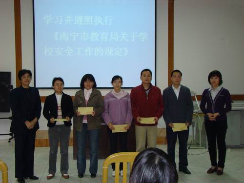此次表彰的高三语文科教师是:林培青、苏开杰、刘辉、杨日观、洪星考,他们执教的高三年级语文科在广西2009届高中毕业会考中一次性通过率达99.1%,远远超出南宁市关于示范性高中高中会考一次性通过率应达95%要求,为此,学校分别给五位教师颁发了奖金。取得初中统考奖的教师是:陆贵佳、周文蜂、邹木兰、张睿玲、莫显瑞、杨虹。他们因所执教的学科平均分均比南宁市统考平均分高5分以上,各科及格率比南宁市统考成绩高5个百分点而获得学校颁发的教学成绩奖金。
