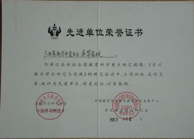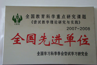 在全国教育科学重点研究课题《尝试教学理论研究与实践》的研究活动中,我校工作积极,成绩显著,被评为全国先进单位,全国学习科学学会尝试学习研究会、中国教育学会数学研究发展中心尝试教学理论研究会向我校颁发了先进单位荣誉证书和牌匾。