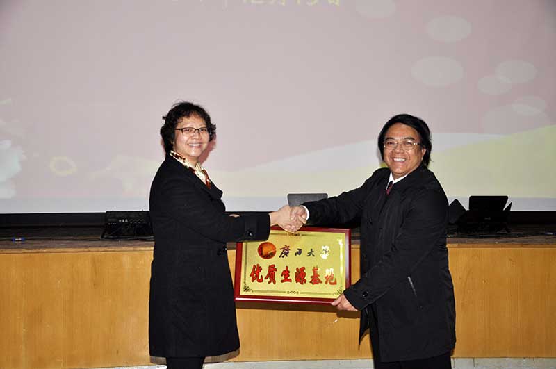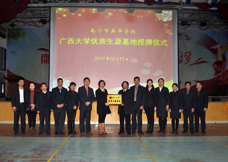 李副书记对英华学校多年来给予广西大学的信任和支持表示衷心感谢。随后,举行授牌仪式,陆强华校长从李莉副书记手中接过了“广西大学优质生源基地”牌匾,全体中层以上领导与李副书记一行合影留念。
