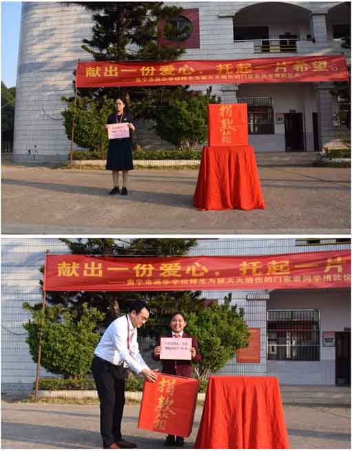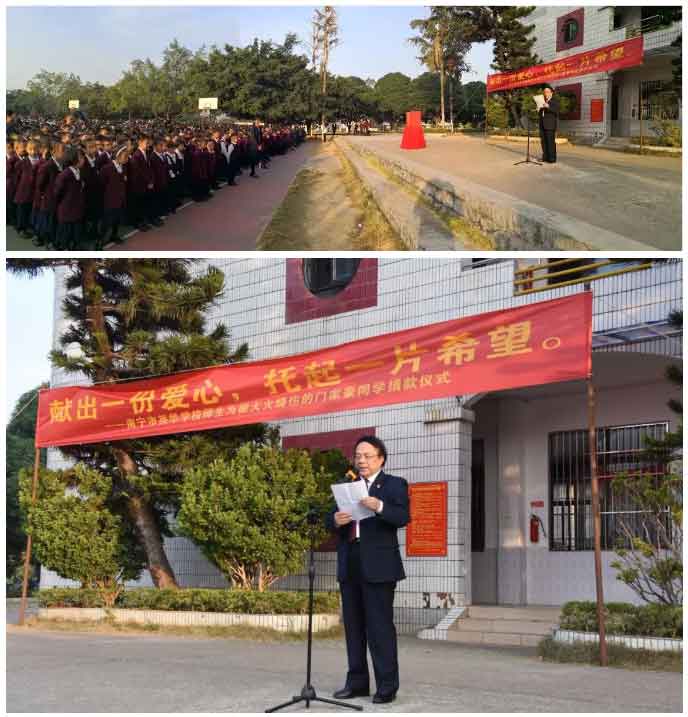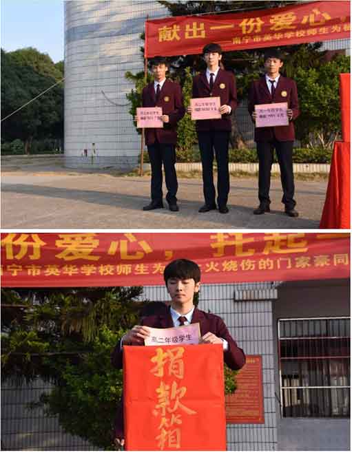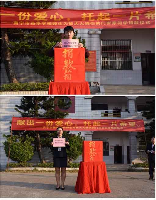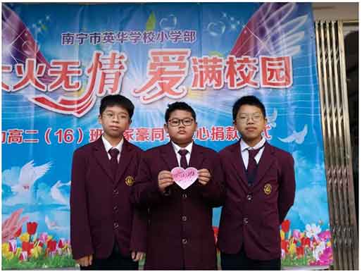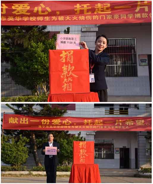 2019年11月11日上午,我校全体师生齐聚升旗广场,举行为遭遇火灾受伤的门家豪同学捐献爱心活动,各学部学生代表、教师代表、行政后勤员工代表、英华房地产代表纷纷上台捐款,此次筹集善款共计272380元,为门家豪同学及家人送去一片片爱心,一句句祝福,一股股冬日的温暖。