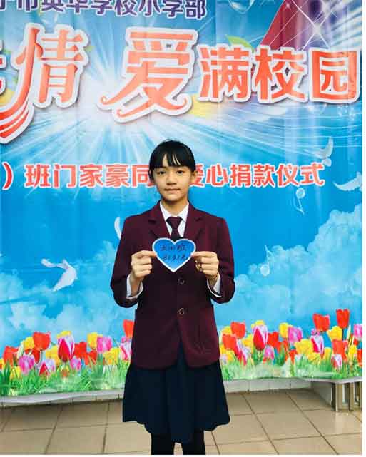 四(2)班的卢晶晶同学和她的妈妈在学校发出捐款倡议当天,分别捐了200元;11月8日,晶晶妈妈又追捐了本来打算买冬装的660元。11月8日下午,卢晶晶的哥哥卢古(卢古是大三学生,曾在英华学校小学、初中、高中就读)以英华校友的名义又单独捐了1000元,这笔钱是卢古同学在学校参加实训的工资。
