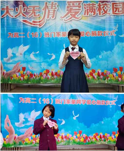 为帮助门家豪同学的家庭筹措医疗费用,学校向全体师生员工发出了献爱心捐款的倡议,在学校董事会和董事长的积极带头下,我校广大师生员工和家长积极响应,涌现出一个个感人的故事。