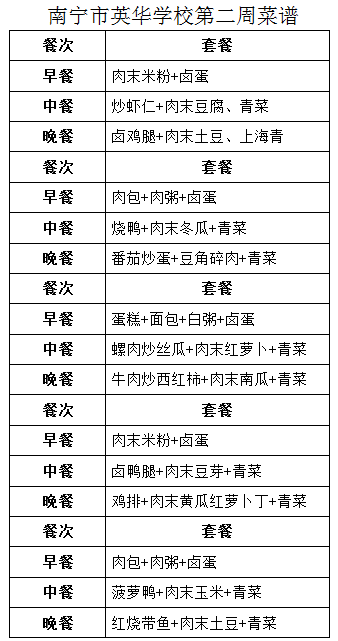 南宁市英华学校就新学期开学三周以来食堂就餐情况进行多次调整、分析和总结,现在认定配餐制是南宁市英华学校最佳的就餐形式,并根据当前市场物价情况,初定本学期初、高中学生用餐标准如下: