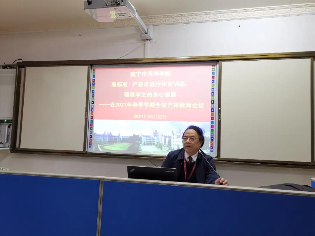 会议上,陆强华校长首先就我校体育艺术组在2020年取得的优异成绩进行了表扬。体育高考再创新高,有了历史性的突破(体育高考术科最高98分,90分以上9,80人分以上21人)。中考体育全部合格,小学部体育特色足球、体育交谊集体舞等项目成绩明显。艺术生术科考试有四名学生获得了“中央美术学院”复试的资格,两名编导的学生术科成绩排名名列(并列)广西第五名。在中小学生体测新标准的要求下,经过我校全体体育教师的共同努力,三个学部的学生体测成绩全部达标。各项体育赛事、艺术晚会开展顺利,这些成绩离不开辛勤付出的全体艺体教师。
