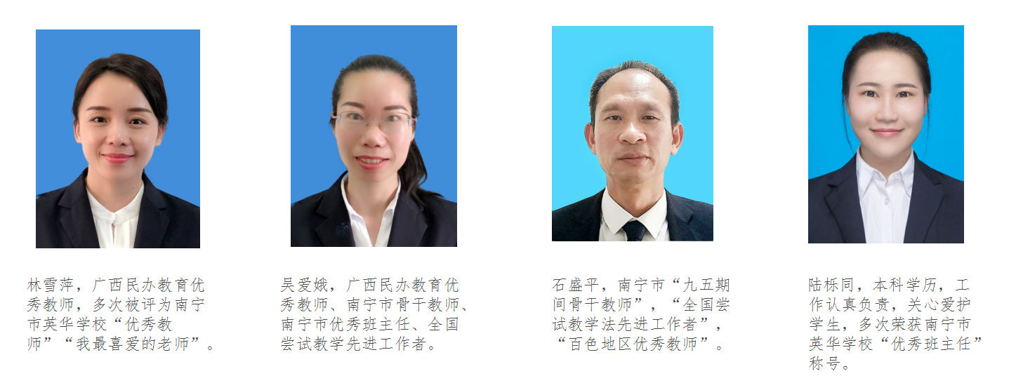 我校师资力量雄厚,其中特级教师、高级教师、自治区、南宁市优秀教师、广西民办学校优秀教师、南宁市“我最喜爱的老师”、市学科带头人和市教学骨干共70多人,是一支敬业爱生、经验丰富、专业素质较高的师资队伍。