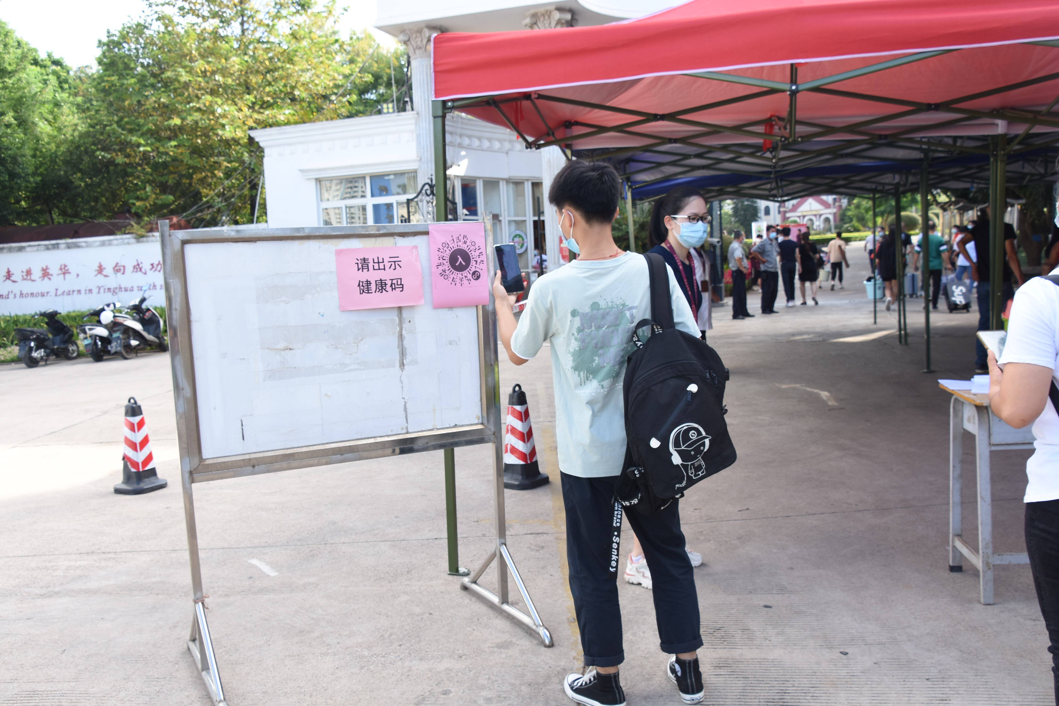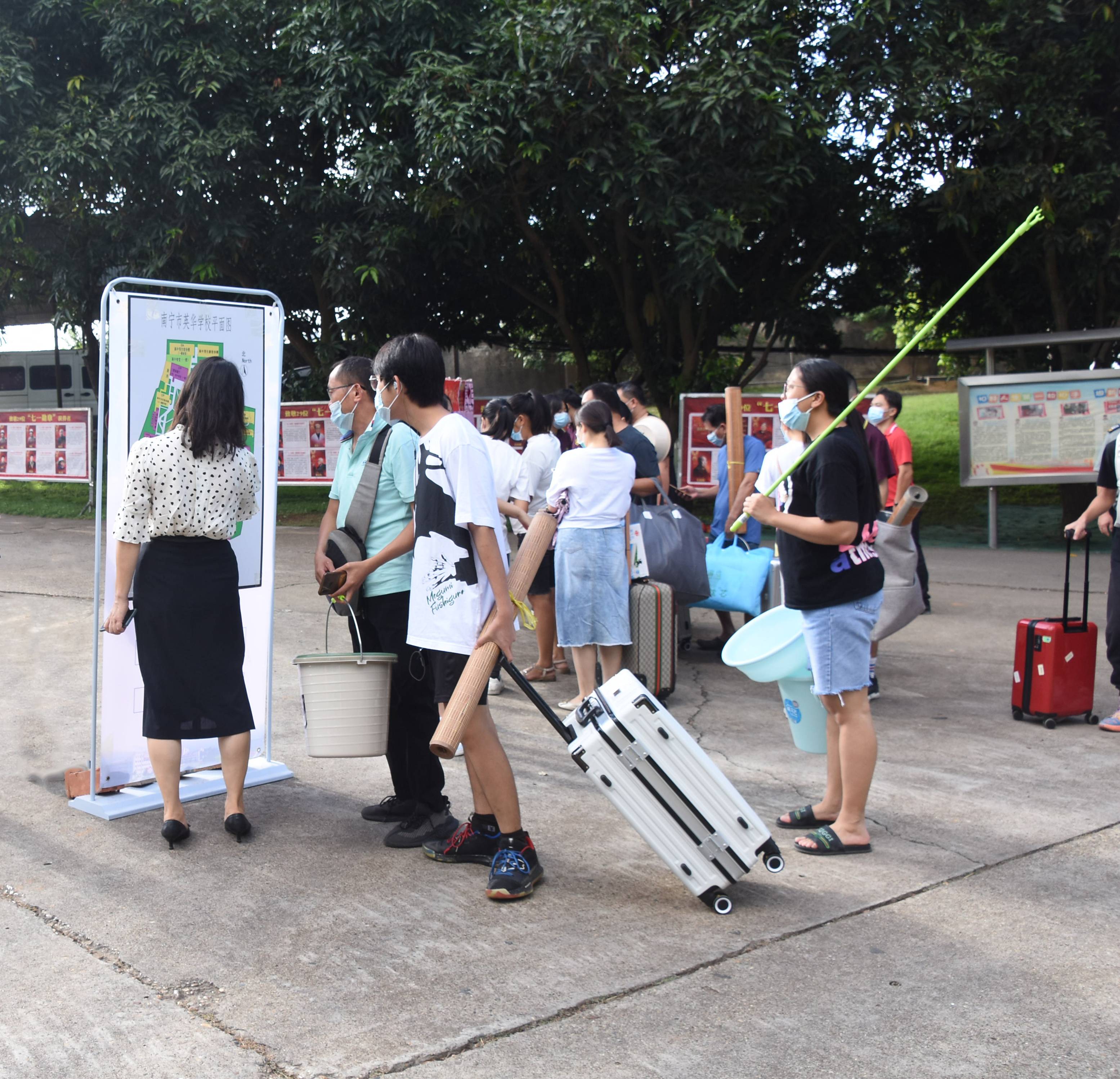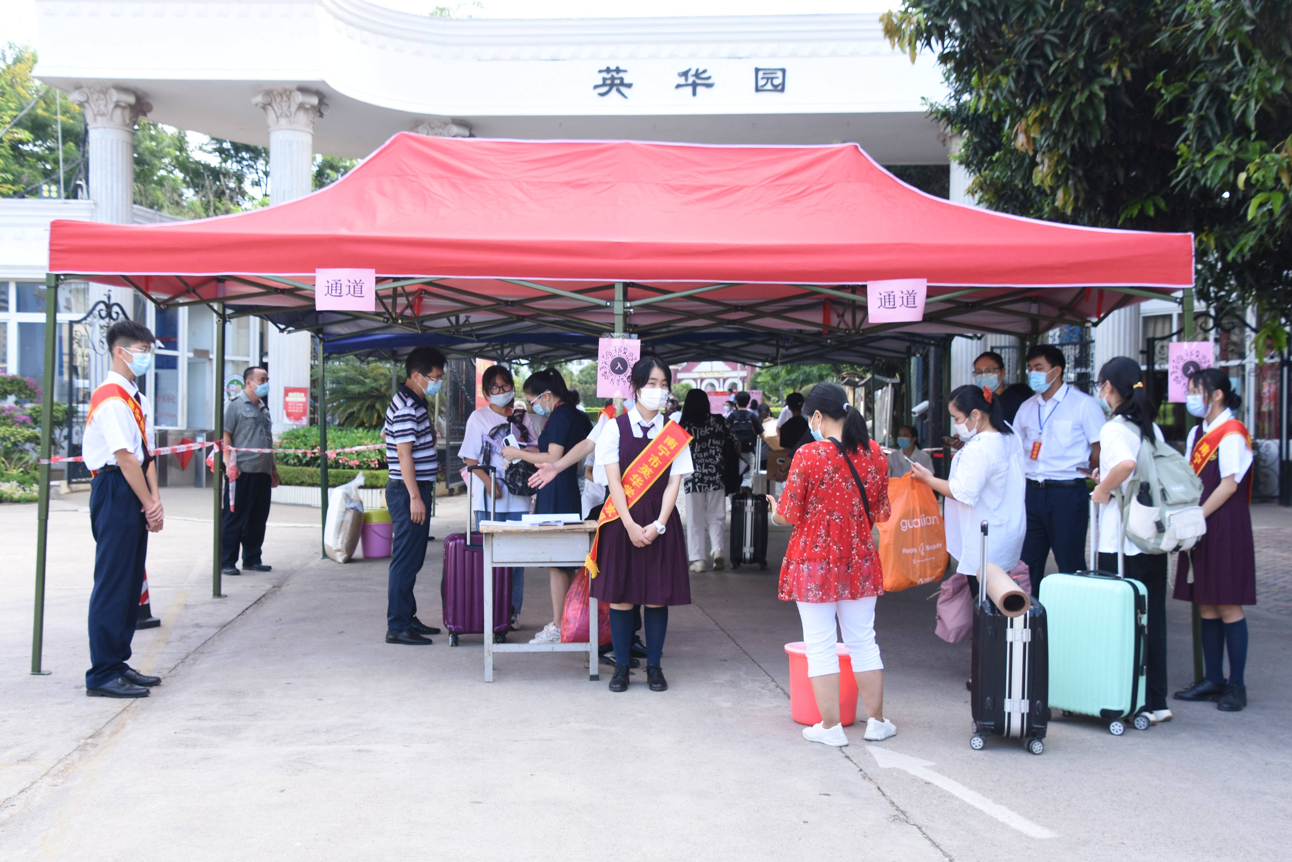 从英华校门口到宿舍楼的路上,一个个穿着整齐的学生会志愿者热情洋溢,积极地为新同学、家长服务。有的从家长手中接过沉重的行李箱,有的为新生指引报到地点,有的在咨询处细心地解答问题,炎炎烈日也挡不住他们的热情,汗水打湿衣襟,丝毫不减热忱。