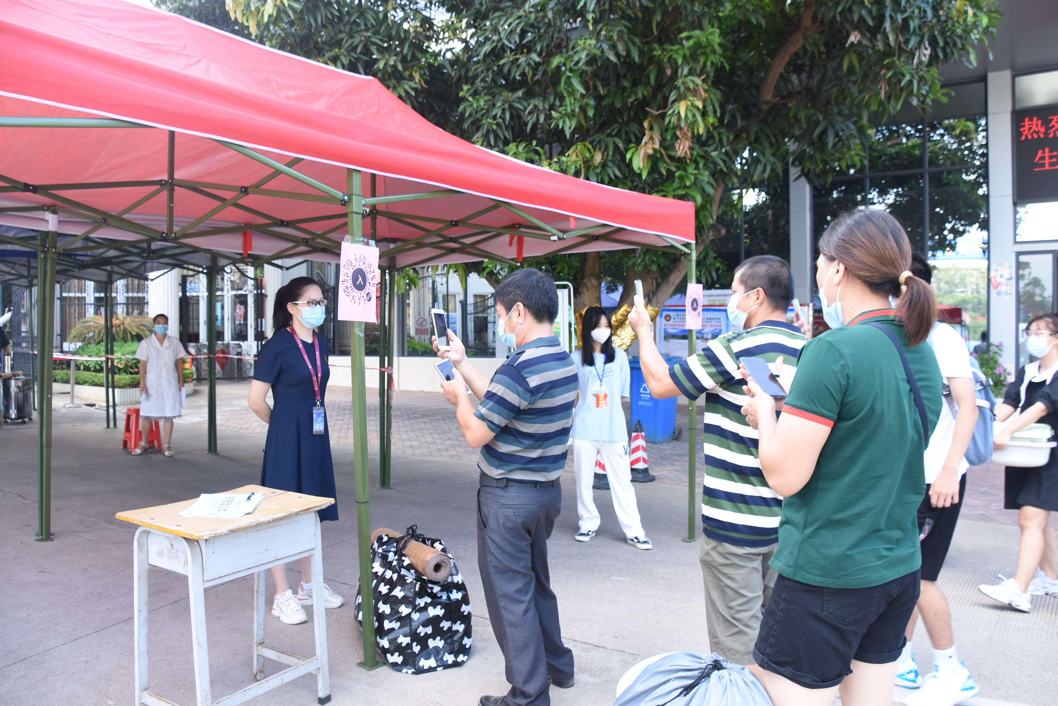 8月27-29日学生返校期间,根据疫情防控要求,我校领导、老师、校医、学生会志愿者在校门口迎接同学们返校,学生、家长进行体温检测,家长出示健康码后有序进入校园。