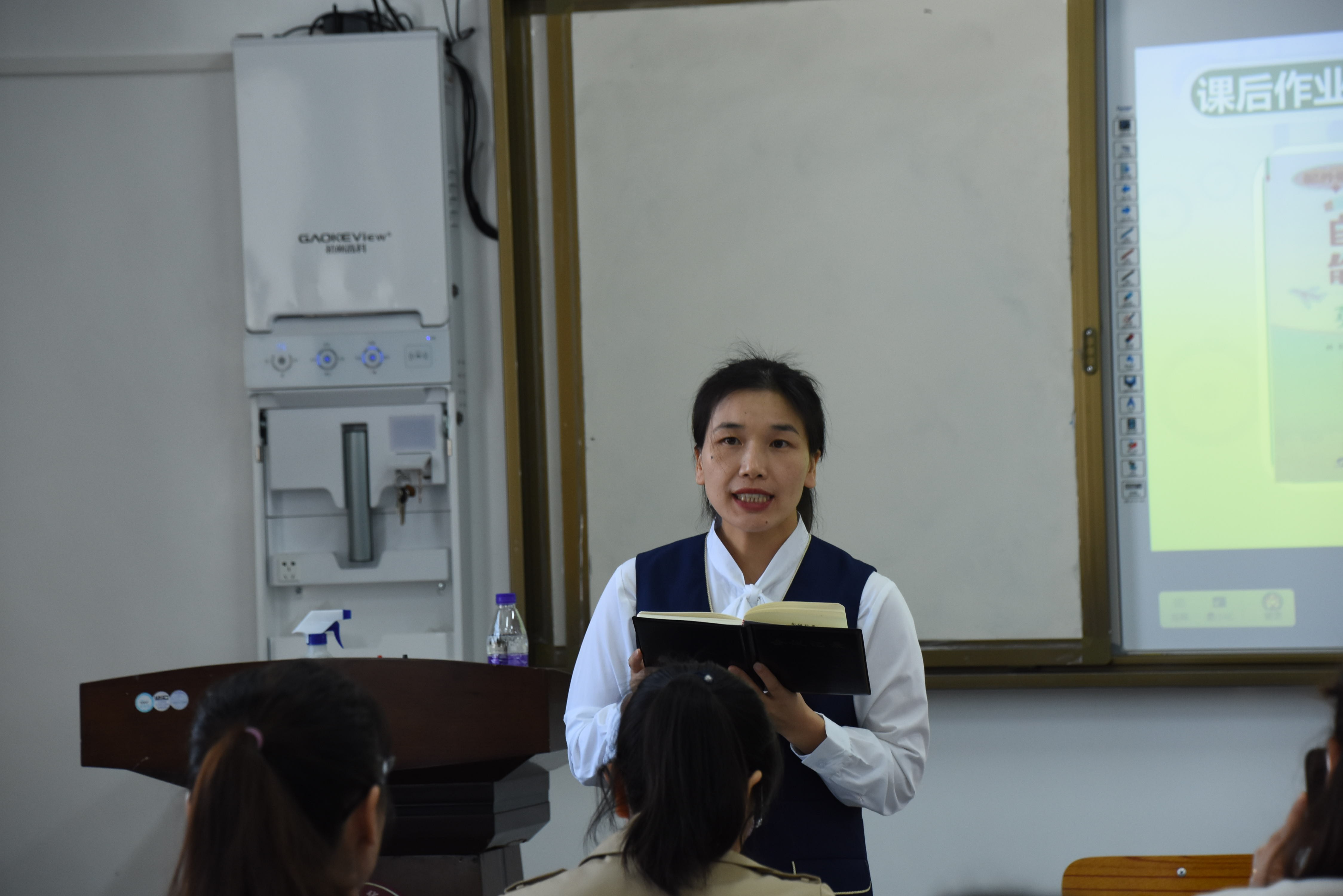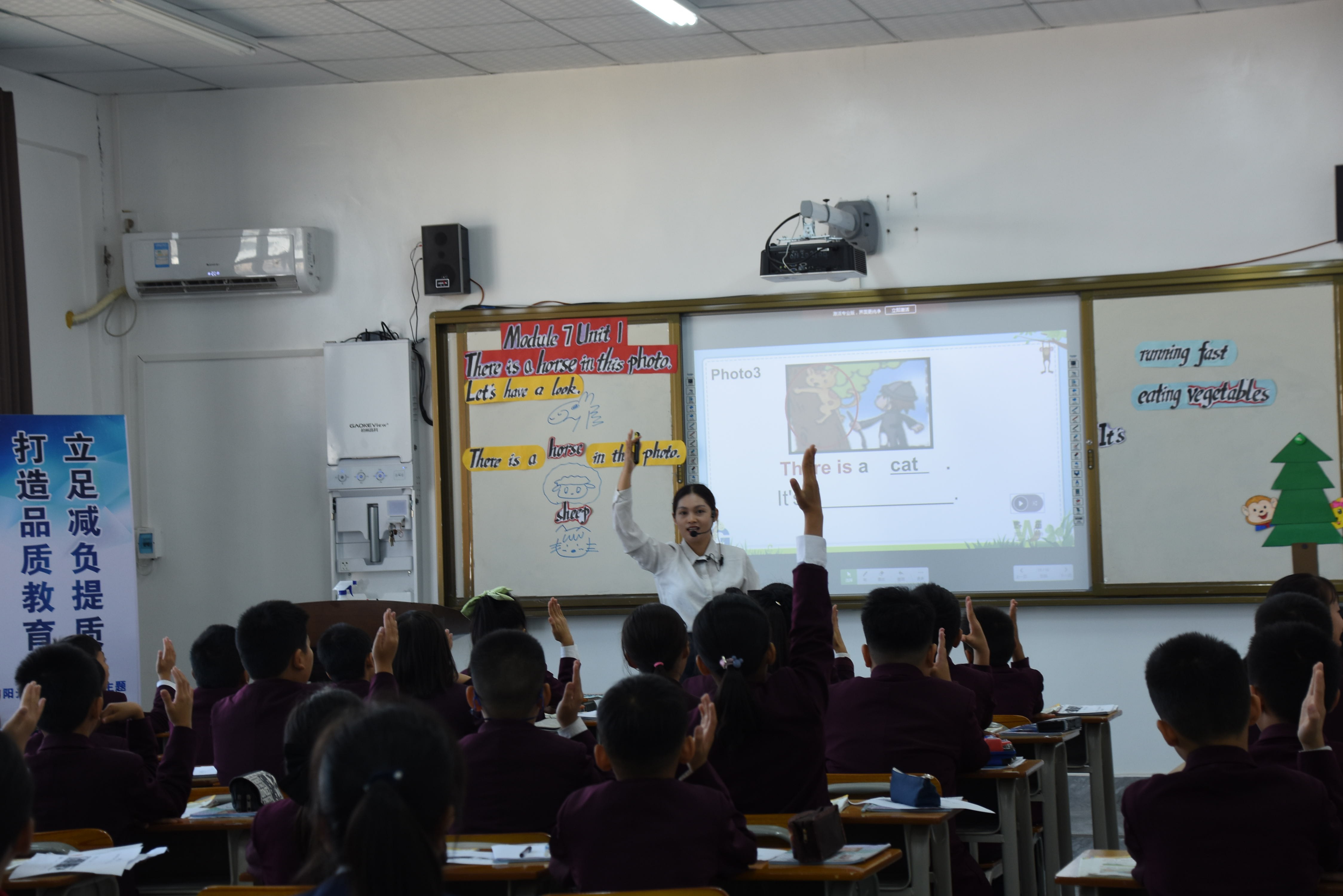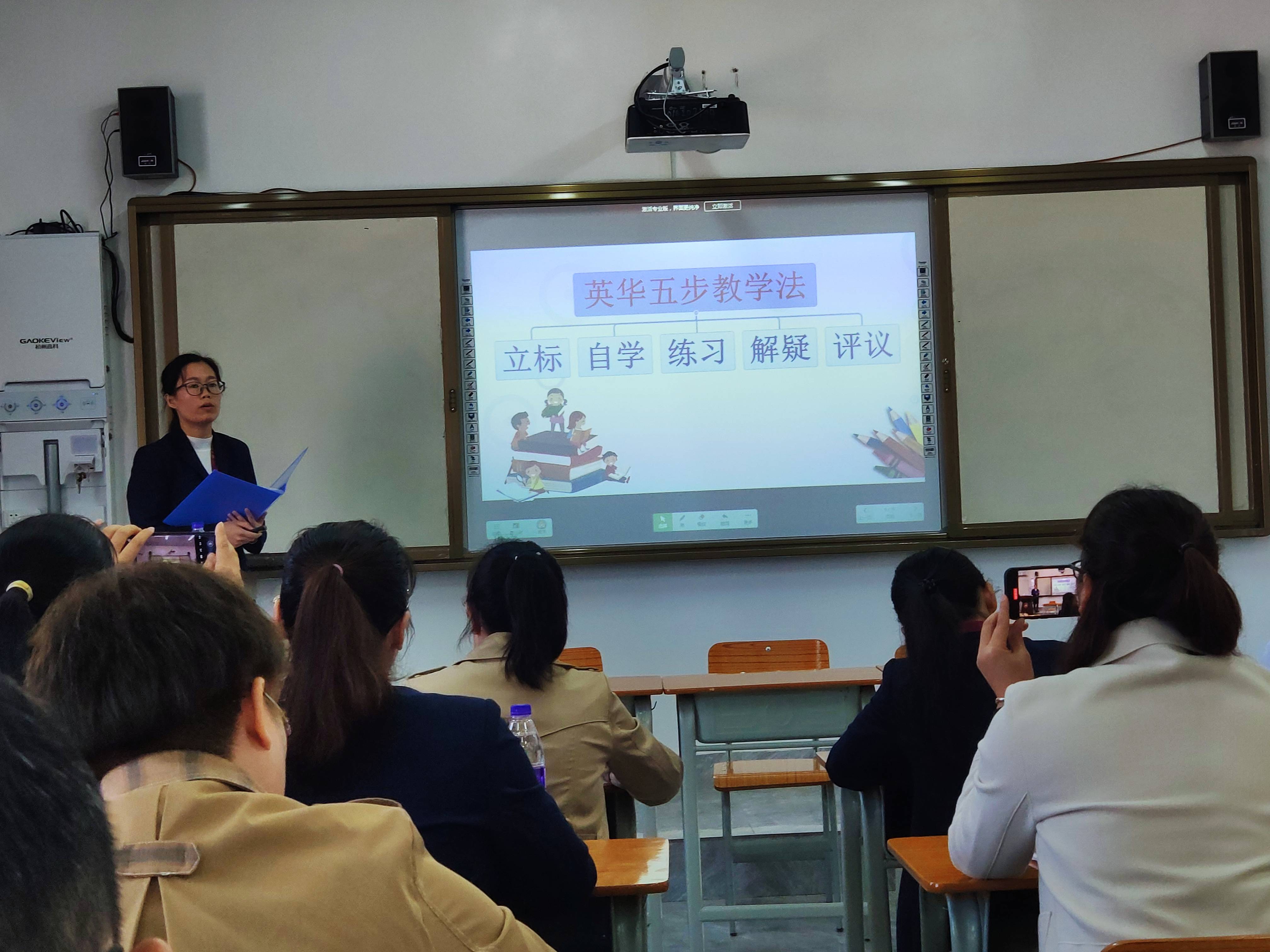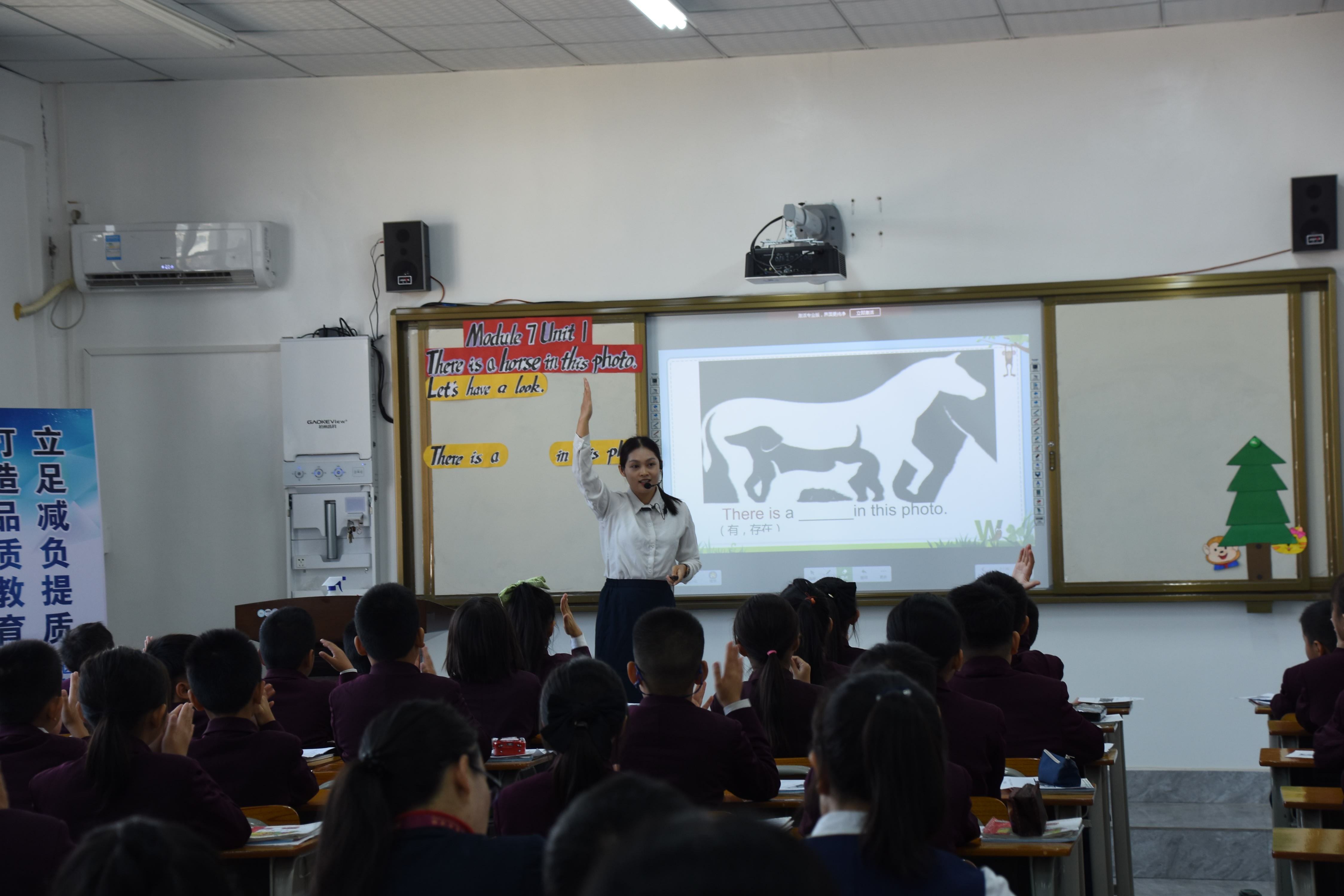 李老师以照片为话题,课前通过分组PK和唱跳热身的方式活跃课堂氛围,充分激发学生的学习热情。在导入环节中展示视觉错位图,成功吸引学生的注意力,让孩子积极主动思考,谈论图片并呈现There is 句型,从而引出本节课的课题There is a horse in this photo.课堂设计自然、连贯,结构紧凑,熟练运用“英华五步教学法”,通过“立标 自学 练习 解疑 评议”五个教学环节,让课堂由浅入深,从易到难,层层推进,环环相扣。整堂课课堂氛围活跃,寓教于乐,学生学习兴趣浓厚。