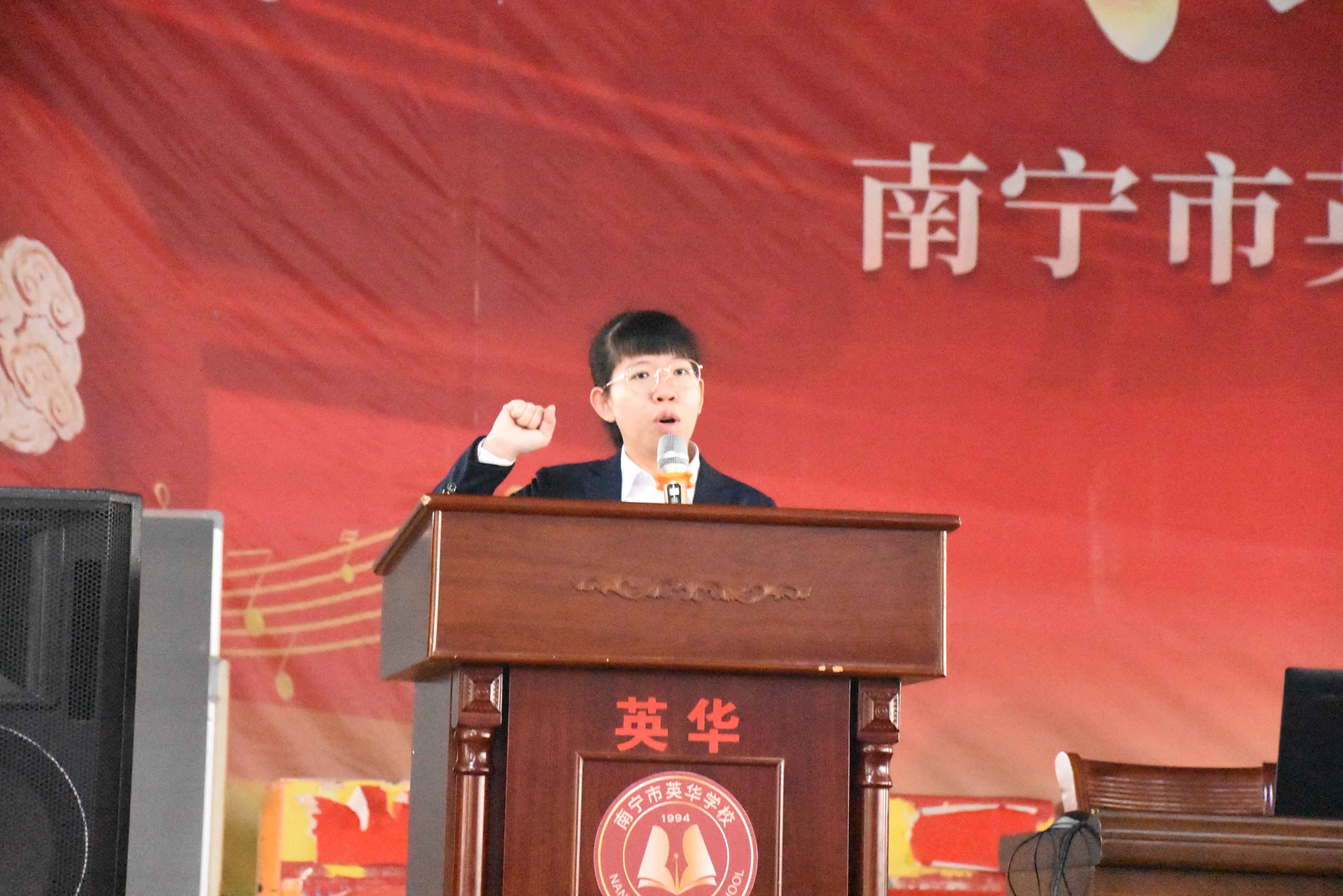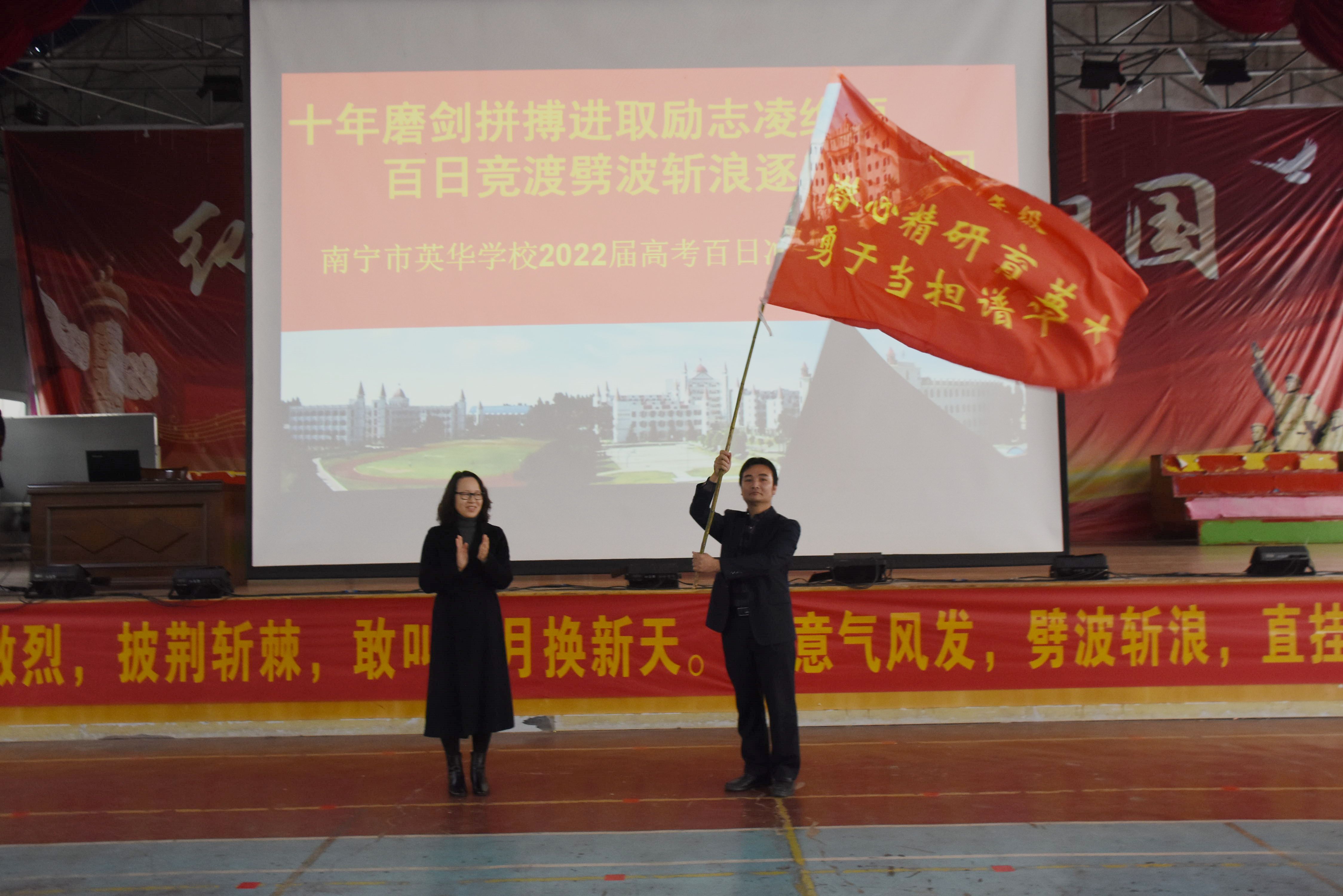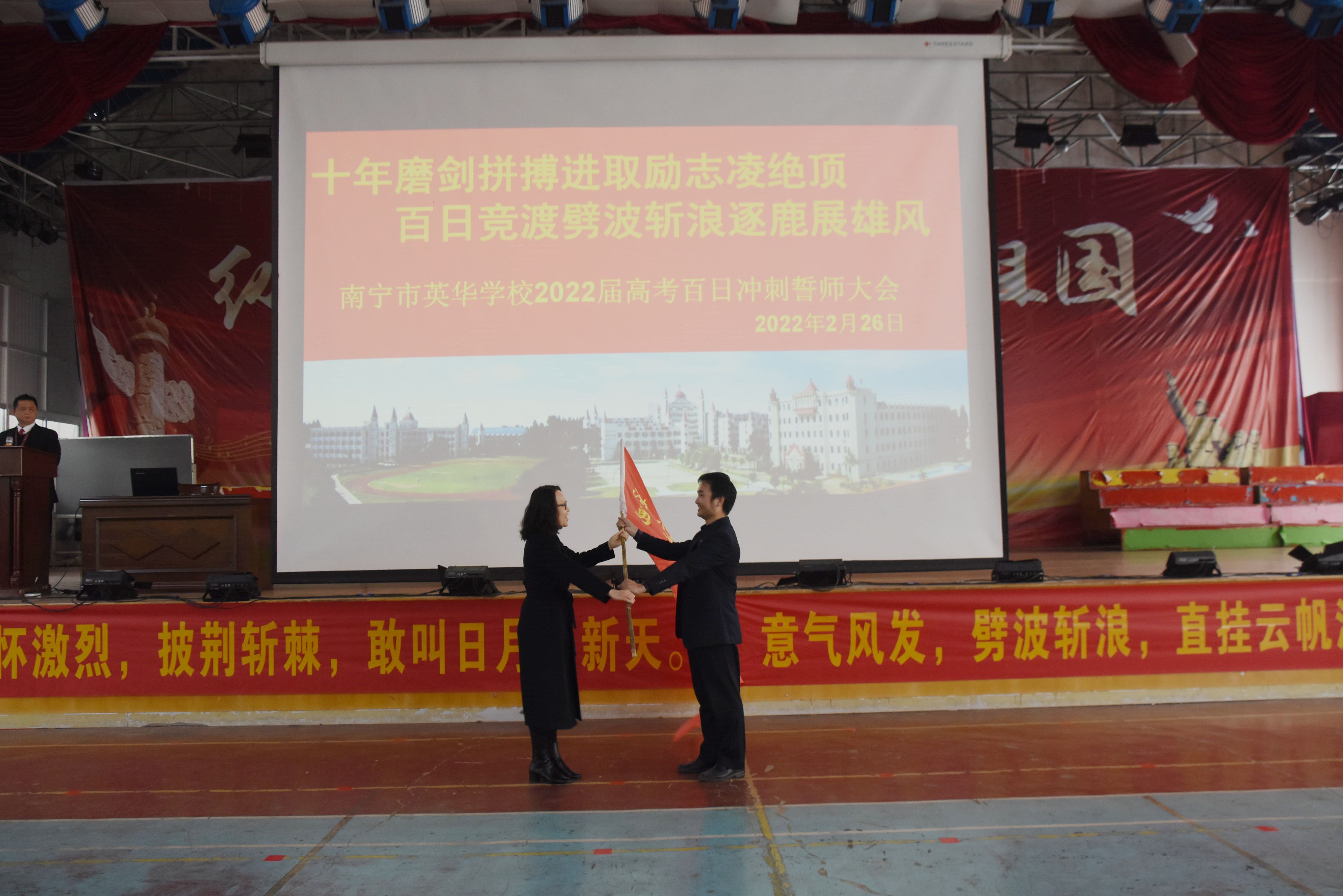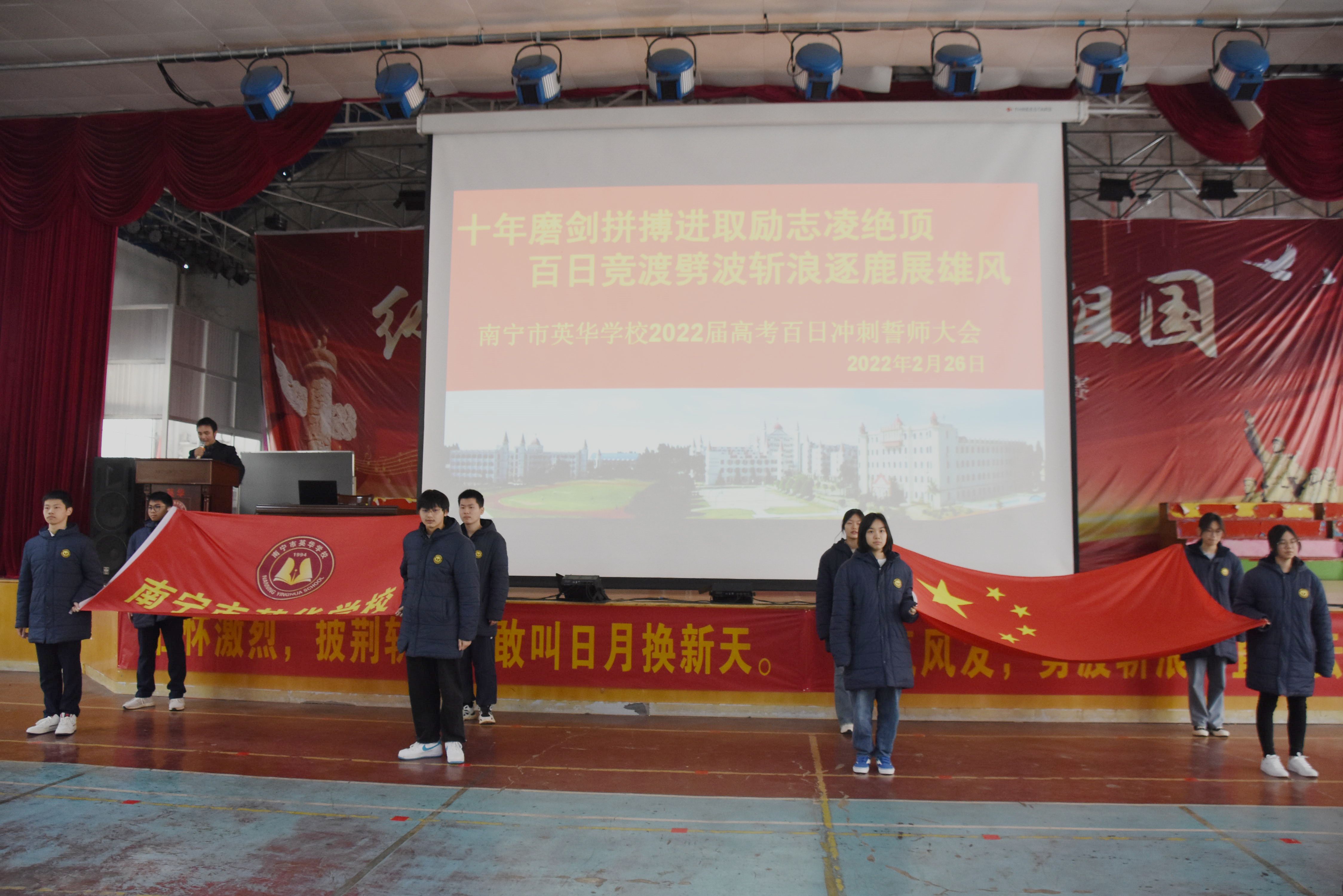拼百日酬壮志,誓凌云铸辉煌。2月26日,在距离高考百日之际,南宁市英华学校举行2022届高考百日冲刺誓师大会,陈春丽校长、潘嘉智副校长、高中部各领导、高三年级全体师生出席活动,吹响高考冲刺的号角。高三师生依次踏上“奋斗路”,穿过“成功门”洪星考副主任主持活动升国旗、奏唱国歌 高三(22)班林振鑫作为学生代表表达心声,号召同学们分秒必争,心无旁骛地投入到紧张的备考复习中,奋斗的青春最美丽!百日共甘苦,相会在巅峰;待到百日闯雄关,定能扬眉夺桂冠!唯有脚踏实地、奋斗拼搏才能圆梦考场!学生代表高三(22)班林振鑫同学发言根据疫情防控规定,学生家长未能到现场见证高考百日誓师。高三(22)班苏卓斌家长作为家长代表录制了加油视频,鼓励同学们不要畏惧挫折与挑战,在百日冲刺的道路上,要相信学校、相信老师、相信自己,携手并肩,全力冲刺高考。全体家长、老师是孩子们的坚强后盾,时刻陪伴在孩子们的身边。高三(22)班苏卓斌家长通过视频为高三学子鼓劲在高考备考的道路上,有一支队伍一直在为高三学子保驾护航,他们就是高三年级组的教师们!芮捷作为教师代表发言,表示在距离高考最后一百天的日子里,全体高三教师一如既往,与学生并肩作战,请同学们相信,艰难险阻师生共同承担,奋战百天,冲刺六月。教师代表芮捷老师发言陈春丽校长以“超越自我,铸就辉煌”为主题发表鼓舞人心的动员讲话,希望同学们要有“高考成功,舍我其谁”的坚定信心;有“直面困难、超越自我”的自强不息精神;要提高应考实力,在一次次实战演习中积累经验,严肃认真对待二轮复习和一次次模拟考试,执着追求,超越自我;要在战略上藐视高考、在战术上重视高考,既仰望天空又脚踏实地,才能笑傲高考。愿同学们都能“劲从心起,心想事成”。随后,陈校长给高三年级授百日征战旗。陈春丽校长作动员讲话陈校长给高三年级授百日征战旗,洪星考副主任接旗,摇旗呐喊壮士气。 在黄泽敏老师的领誓下,高三全体教师上台,高举右拳,郑重宣誓:一百天,师生同心;一百天,师生同伴;竭尽全力,奋战一百天。在学生代表苏卓斌同学的领誓下,全体学生,高举右拳,郑重宣誓:做一个上进的人、认真的人、大气的人、坚强的人、执着的人,全力以赴,永不放弃。 宣誓结束后,全体师生在励志横幅上签名,写下奔赴高考的决心。班主任给学生发放许愿带,学生在许愿带上写下愿望,放飞梦想。 学生许愿,放飞梦想 誓搏百日拼风雨,功成六月定乾坤。高考百日誓师大会是圆青春梦想的动员令,是扬人生志向的进军号,是高考学子剑指苍穹、鏖战沙场,再创高考奇迹的前奏曲。英华学校高三全体师生必将振奋精神,勤学苦钻,奋战100天,笑傲六月,无悔青春!图文丨蒋云审核丨许文锋 李克艳