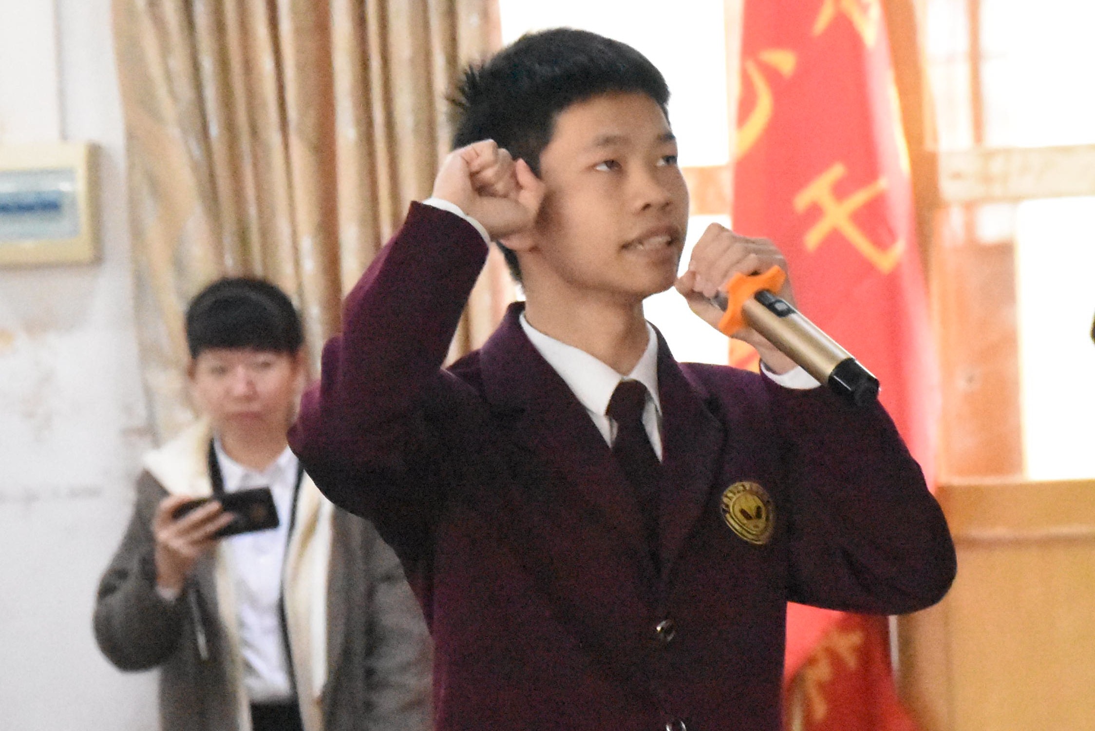 高三(22)班林振鑫作为学生代表表达心声,号召同学们分秒必争,心无旁骛地投入到紧张的备考复习中,奋斗的青春最美丽!百日共甘苦,相会在巅峰;待到百日闯雄关,定能扬眉夺桂冠!唯有脚踏实地、奋斗拼搏才能圆梦考场!
