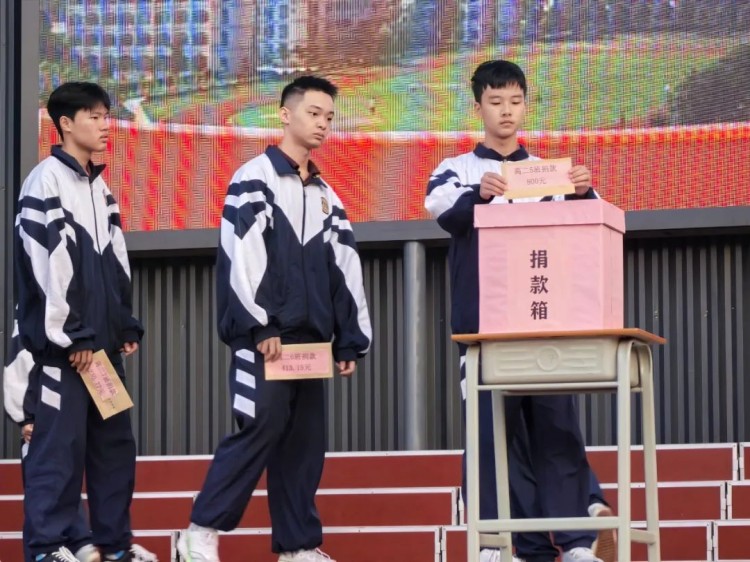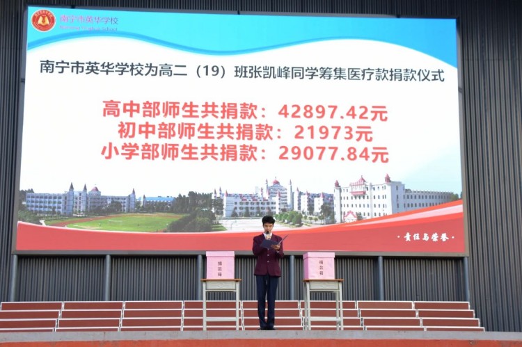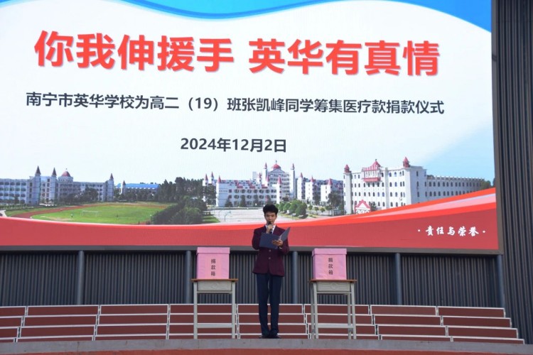 爱心点燃希望,真情温暖人心。12月2日上午,南宁市英华学校为高二(19)班张凯峰同学筹集医疗款捐款仪式在足球场举行,这是一场由全校师生和部分家长共同参与,满载温暖与力量的活动。