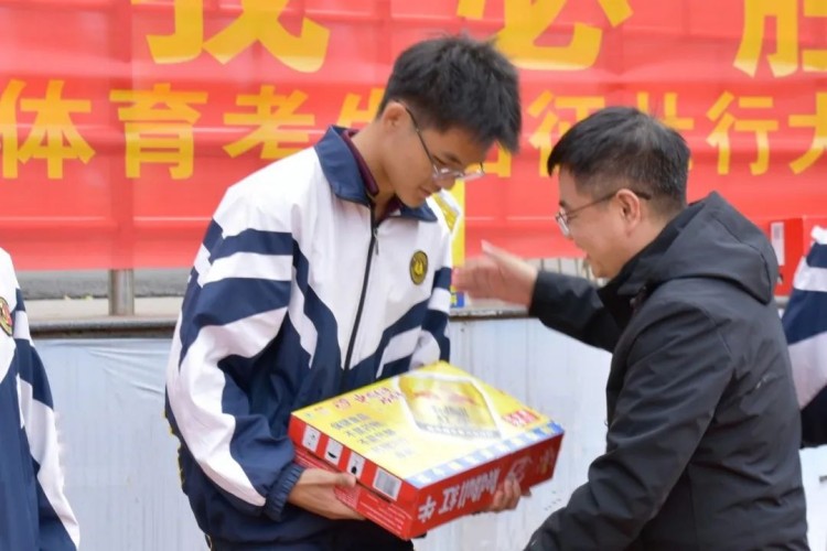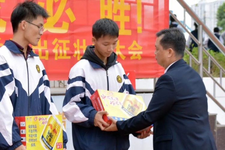 谢副校长、蒲副校长给高三体育生代表赠送慰问品,寓意红红火火、牛气冲天。