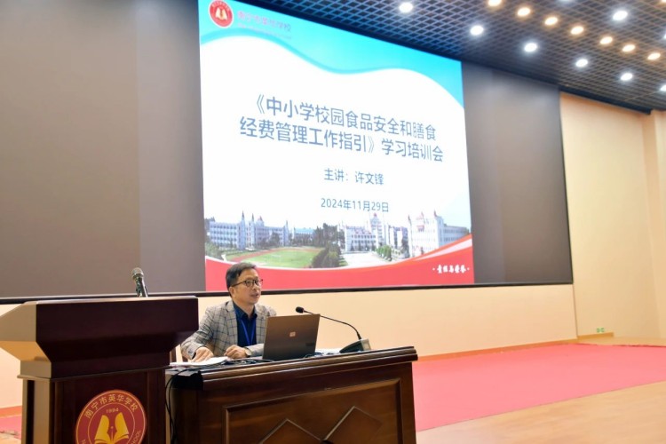 许文锋副校长根据《中小学校园食品安全和膳食经费管理工作指引》文件对与会人员开展业务培训,从政策出台背景、食品安全事故案例、学校食品安全事故带来的影响、上级行政部门的要求、《工作指引》内容等五个方面进行讲解,强调全体工作人员要认真贯彻落实文件的相关要求,高度重视校园食品安全,严把食材供货关,严格规范食材进货查验,把工作做实做细。
