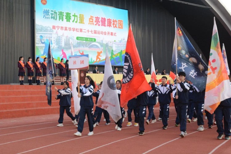 运动会开幕式精彩纷呈。伴随着激昂的运动员进行曲,国旗、校旗、主题牌、校徽、彩旗、裁判员、社团、各年级学生方阵相继入场。他们身姿挺拔、步伐矫健,彰显出英华师生朝气蓬勃、昂扬向上的良好精神风貌.