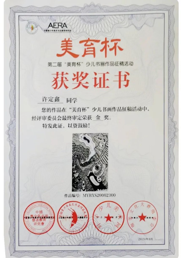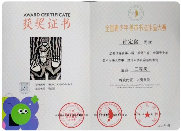许定鑫同学荣获第八届“妙笔生花”全国青少年美术书法作品大赛二等奖