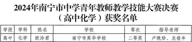 热烈祝贺我校高中化学组欧泠君老师荣获2024年南宁市中学青年教师教学技能大赛决赛(高中化学)二等奖!指导老师卢晚珍、龙俊年。